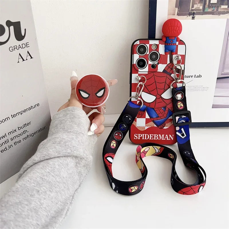 Cartoon 3D Spiderman Plaid Phone Case With Holder Lanyard For iPhone