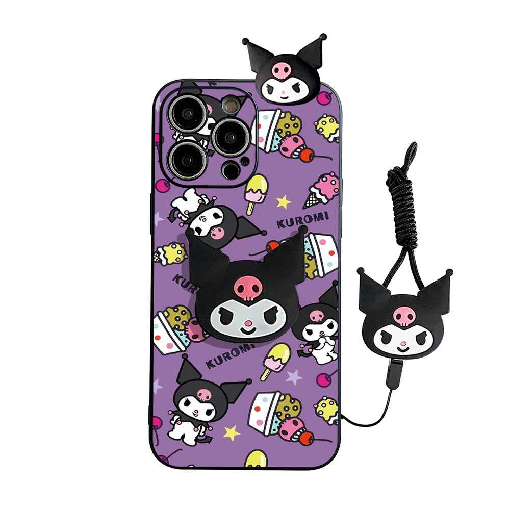 Cartoon Kuromi Head Case With Holder Rope Phone Case