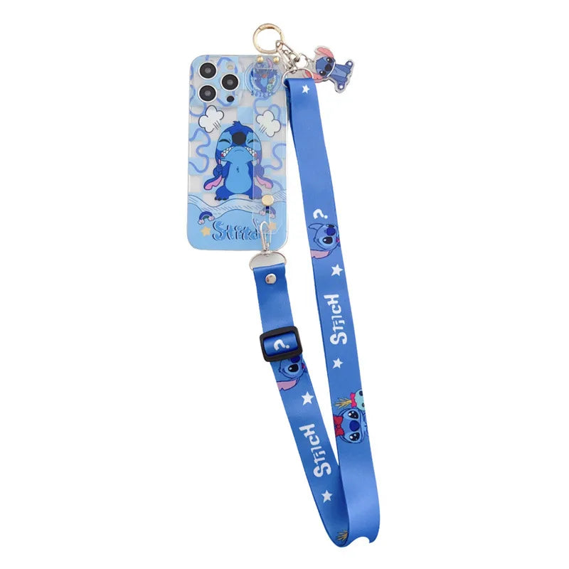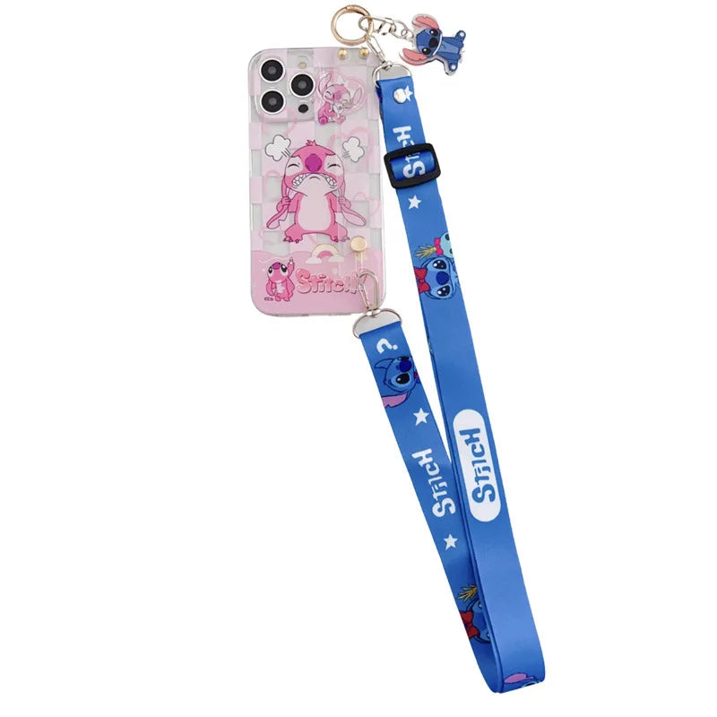 Cute Cartoon Stitch Couple Phone Case With Clear Strap Lanyard For iPhone