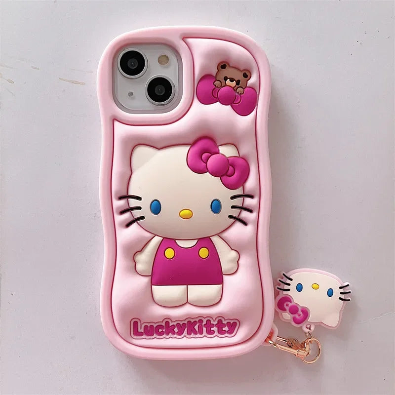 This soft silicone phone case features a charming kawaii Hello Kitty design with a playful wave pattern and an attached pendant for added style. Designed specifically for iPhone models, it offers reliable protection against everyday bumps and scratches while maintaining a comfortable grip. The flexible silicone material ensures easy installation and removal, combining durability with a cute, unique look that appeals to Hello Kitty fans and those seeking both functionality and personality in their phone accessories.
